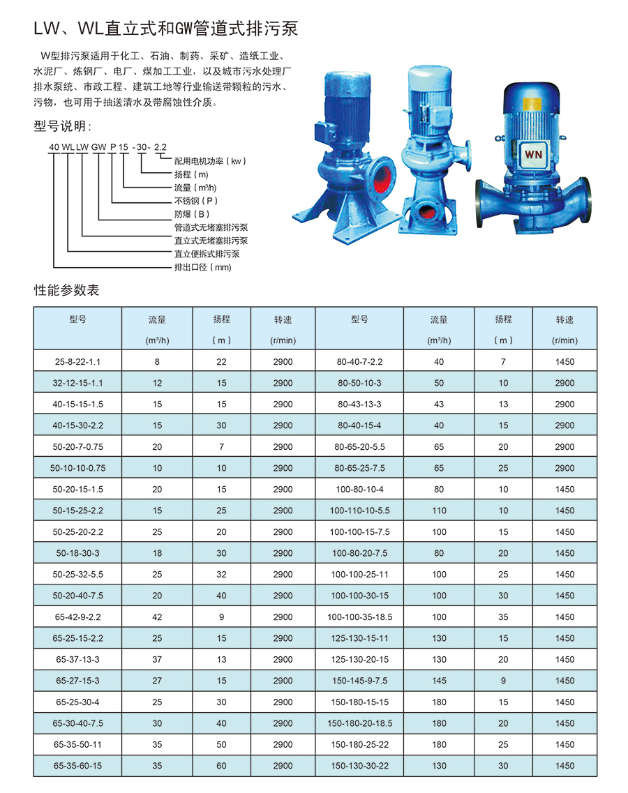 • 产品名称:LW、WL直立式和GW管道式排污泵